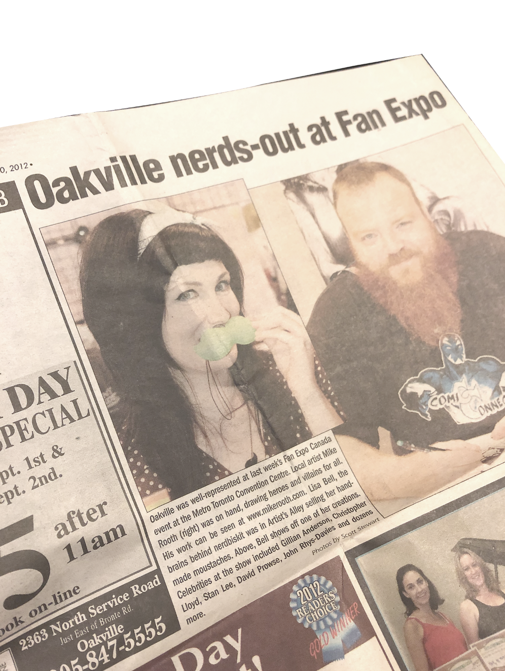 “...Lisa Bell, the brains behind nerdbiskit was in Artist’s Alley selling her handmade moustaches. Above, Bell shows off one of her creations.”